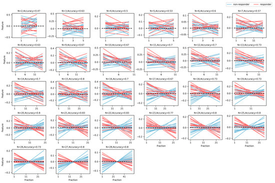 Figure 4 shows the trending patterns of the LRT derived from PTV features using the SW model for all 30 patients, and the model results for N fractions are shown separately, where N = 2–28. The red lines denote trending plots for the responders, the blue lines are for non-responder patients, and the classification accuracy of the SW model uses 0 as the threshold. The classification model is directly weighted and summed based on the U-test feature screening results. The average accuracy of the GTV and PTV regions in 13 experiments before the first 15 treatments (N: 2–14) is 0.53 and 0.62, respectively. The average accuracy of six experiments with features from 15 to 20 treatments (N: 15–20) is 0.662 and 0.738, respectively, while the average accuracy of features from more than 20 treatments in eight experiments (N: 21–28) is 0.671 and 0.795, respectively.