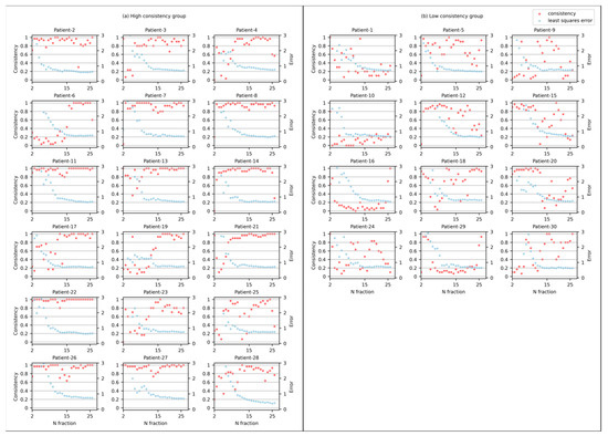 Consistency as a function of # fraction for (a) the high-consistency group, and (b) the low-consistency group. The red dots mean patient consistency (left Y-axis), the blue dots mean patient least-squares fit error (right Y-axis).