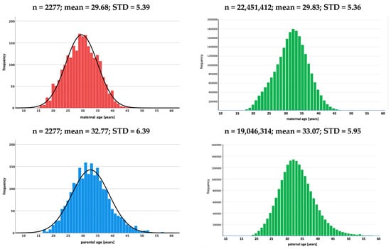 Mothers of patients included in the study (cases) were between 15 and 46 years of age (mean age: 29.68 years, standard deviation (STD): 5.393 years), and fathers were between 17 and 69 years of age (mean age: 32.77 years, standard deviation: 6.39 years). The control data set consisted of a total of 22,451,412 females aged 16–49 years and 19,046,314 males aged 15–54 years. The age distributions and descriptive statistical parameters for cases and controls are shown in Figure 1.