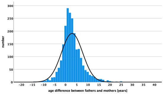 The correlation between maternal and paternal age was only possible to analyze in the patient group. This information is lacking in the controls as there was no link between the age of the mother and the father of a single child. Fathers are, in mean, 2.96 ± 4.76 years older (min = −18 and max = 32 years) than mothers of a child with WT. The distribution of age differences between mothers and fathers for children with WTs is shown in Figure 2.