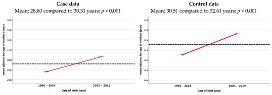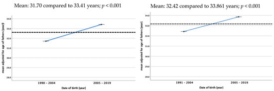 Maternal and paternal age increased during the analyzed time period in the control group and the patient group in fathers and mothers. In the patient group, the mean parental age was significantly lower in 1991 (30.28 years) compared to 2019 (34.04), and in the control group, it was 31.29 years in 1991 compared to 34.23 years in 2019. For mothers, the mean ages were 27.68 in 1991 and 29.79 years in 2019 and 28.88 and 32.47 years, respectively. No differences were found between the mean ages of cases and controls during the whole study period for either fathers or mothers. Figure 3 shows the mean adjusted age of two 15-year time periods (1990/1991–2004 and 2005–2019) for fathers and mothers in both cohorts.