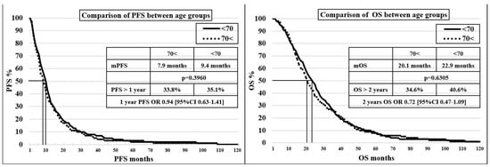 In the 70< and <70 groups, no significant difference was found in terms of mPFS (7.9 vs. 9.4 months,
