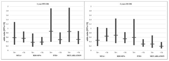 p = 0.0032). In the <70 group, metastasis ablation strongly affected all parameters tested, particularly survival outcomes. Therefore, in a direct comparison of the two age groups, a significant difference was demonstrated between the ablated groups regarding mPFS and mOS (