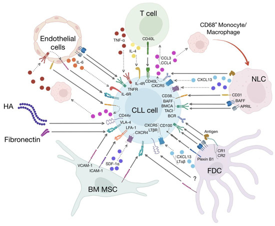 FDCs are specialized cells of stromal origin primarily resident in the germinal centers of lymphoid tissues [63]. Here, they interact with other stromal cells, such as fibroblasts and ECs, creating a complex network that supports lymphocyte survival, migration, and activation [64]. In the IGH enhancer T-cell leukemia-1 oncogene (Eμ-Tcl1) transgenic mouse model of CLL, it has been shown that the crosstalk between FDCs and tumor B cells is essential to supporting the consecutive steps of leukemia pathogenesis by inducing a proper localization of CLL-like tumor cells within lymphoid follicles [65]. This crosstalk is mediated by the CXCL13–CXCR5 and the lymphotoxin beta receptor (LTβR)/lymphotoxin alpha beta (LTαβ) signaling axes. FDCs inhibit spontaneous apoptosis in vitro through direct cell–cell interactions that are mediated by the ligation of CD44 on CLL cells [66] and the engagement of semaphoring CD100 expressed on CLL cells and its counter receptor plexin B1 [67]. Moreover, FDCs are capable of sustaining CLL proliferation and survival by many other mechanisms, including BCR activation on CLL cells during the presentation of unprocessed antigens via complement receptors 1 (CR1/CD35) and 2 (CR2/CD21) and the expression of survival factors such as BAFF and a proliferation-inducing ligand (APRIL) and molecules involved in CAMDR, including VCAM-1 [39]. These studies highlight that FDCs are an important component of the stromal microenvironment, particularly in secondary lymphoid organs.