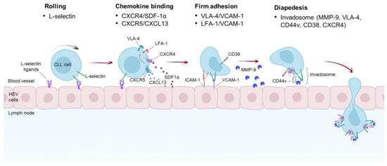 Early studies focusing on the correlation between the expression of different surface molecules and the migratory potential of CLL cells showed that low levels of L-selectin were linked to a defective TEM in CLL [121,122]. These observations are in line with a subsequent study showing that BCR engagement results in a downregulation of CXCR4 and L-selectin, which inhibits the egress of CLL cells from the LN, leading to an accumulation of leukemic cells in this protective niche [123]. Paradoxically, L-selectin seems to be overexpressed in CLL cells that reside in the LN and BM niches compared to those circulating in the blood stream, and the long-term culture of CLL cells in vitro is accompanied by an increase in L-selectin expression, suggesting a pro-survival role of this protein in the proliferation centers [124]. Recently, an in vivo functional study using intravital microscopy and multiphoton imaging has shown that L-selectin mediates the interaction between CLL cells and the high endothelial venules (HEV) of the LNs and is required for the first step of CLL TEM, indicating that L-selectin could represent a valuable target to inhibit CLL homing into the LNs [125].