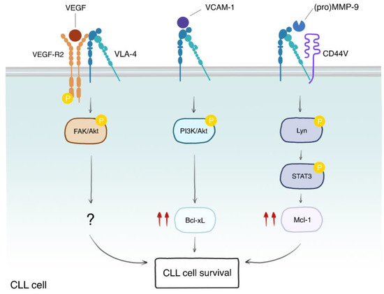 As previously discussed, VLA-4 is the main integrin responsible for the interaction between CLL cells and the cellular as well as a-cellular components of the microenvironment, such as BM MSCs, FDCs, ECs, and fibronectin. VLA-4 is capable of reducing spontaneous apoptosis in vitro in CLL cells cultured in the presence of its recombinant ligands, such as VCAM-1, fibronectin, and the globular C1q (gC1q) domain of elastin microfibrilinterfacer-1 (EMILIN-1) [178,179]. Moreover, engagement of VLA-4 by recombinant fibronectin protects CLL cells from fludarabine-induced apoptosis, in particular cells expressing high levels of CD49d [155]. The mechanisms of fibronectin-induced protection from fludarabine involve the upregulation of Bcl-xL and downmodulation of TP53 [109,180]. VLA-4 cooperates with LFA-1 in mediating pro-survival signals from the BM MSCs and ECs that rescue CLL cells from spontaneous and drug-induced apoptosis [103,181]. Although these data indicate that VLA-4 and integrins protect CLL cells from apoptosis, one study reported that recombinant VCAM-1 and BM MSCs did not inhibit spontaneous apoptosis in both CD49d-positive and -negative isolated CLL cells [182], failing to demonstrate these effects. This discrepancy may be due to the specific time points chosen to evaluate apoptosis or to the different BM MSCs used to model the microenvironment. Besides its function in CLL TEM, binding of the proMMP-9 and its active form to the VLA-4/CD44 docking complex stimulates CLL survival [183]. This intracellular pathway relies on the upregulation of Mcl-1 induced by activation of the signal transducer and activator of transcription (STAT3) in a lymphocyte-specific protein tyrosine kinase (Lck)/Yes novel tyrosine kinase (Lyn)-dependent manner. This survival pathway is active in CLL cells regardless of their IGVH mutational status, CD38 and ZAP70 expression, and is independent of the MMP-9 catalytic activity. Of note, VLA-4 engagement by either MMP-9 or VCAM-1 has different outcomes, as MMP-9 promotes Mcl-1 upregulation while VCAM-1 induces Bcl-xL. [183]. Moreover, the binding of VCAM-1 to VLA-4 induces a different signaling pathway that relies on the activation of phosphoinositide 3′-kinase (PI3K)/Akt kinases. Interestingly, VLA-4 has been found to associate with VEGF receptor 2 (VGEF-R2), which seems to be necessary for the binding of CLL cells to VEGF [184]. Engagement of the VLA-4/VGEF-R2 complex by VEGF activates a survival pathway that involves the phosphorylation and activation of focal adhesion kinase (FAK) and Akt, though the downstream molecular players of this survival signaling cascade were not examined in this study [184]. All these data indicate that VLA-4 outside-in survival signals strongly depend on the type of ligands and binding partners (Figure 3). The association of CD38 and CD49d stimulates the adhesion of CLL cells to VCAM-1 and induces protection from spontaneous apoptosis. Indeed, CD49d/CD38 double-positive cells are more viable compared to CD49d-positive CD38-negative cells when cultured on recombinant VCAM-1, demonstrating a functional synergy between these two molecules. CD38 indirectly induces CD49d-positive CLL cell survival by increasing the expression of VCAM-1 on endothelial cells [77].