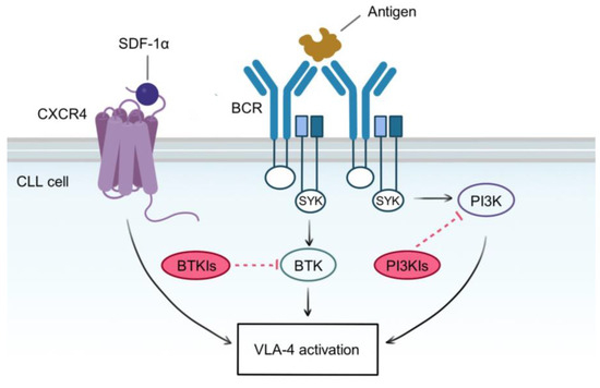 Due to their role in TEM, adhesion, and CAMDR, it is not surprising that these adhesion molecules have been considered relevant targets for CLL treatment. Direct targeting of CD49d using the anti-VLA-4 antibody natalizumab has been explored only in vitro. In these studies, natalizumab was capable of overcoming stroma-mediated drug resistance to rituximab in a panel of B-lymphoma cell lines [186] and also decreased CLL migration in a physiologically relevant model of lymphocyte migration [187], demonstrating that direct targeting of CD49d may have therapeutic implications in CLL. However, modulation of adhesion molecules in CLL is mostly achieved indirectly by clinically relevant drugs, such as the BTKi ibrutinib. It has in fact been shown by our group that in patients treated with ibrutinib plus rituximab, there was a significant downmodulation of adhesion molecules, including CD38, CD43, CD44, CD62L, and CD49d [188]. In a follow-up study, it was also demonstrated that patients with a greater downmodulation of CD49d experienced a deeper and prolonged tumor burden reduction [189]. Indeed, ibrutinib and other BTKis, but also the spleen tyrosine kinase (SYK) inhibitor fostamatinib and the phosphoinositide 3′-kinase (PI3K) isoform p110δ (PI3Kδ) inhibitor idelalisib, have similar clinical manifestations consisting in a rapid resolution of lymphadenopathy and a redistribution of CLL cells from the tissues into the circulation accompanied by a transient lymphocytosis [190,191,192]. LN shrinkage and CLL re-localization can be explained by the disruption of CD49d-dependent adhesion induced by BTKi and idelalisib [190,193]. VLA-4-mediated adhesion is enhanced in CLL cells by antigen-dependent BCR engagement as well as CXCR4 stimulation through an inside-out signaling pathway that involves several kinases such as BTK, SYK, and PI3K [149,194,195,196]. This inside-out pathway provides the mechanistic link between the BTK inhibition and the observed lymphocytosis as BTKis block BCR-dependent BTK activation and the subsequent CD49d-mediated cell adhesion [194,197,198]. Notably, CD49d-positive CLL patients experience reduced LN shrinkage and lymphocytosis, and the degree of CD49d positivity correlates with an inferior response to BTKis, such as ibrutinib and acalabrutinib [194,195]. This inability of the BTKis to elicit a proper response in CD49d-positive patients was attributed to residual VLA-4 activity due to a BCR-independent signaling pathway, such as CXCR4-mediated VLA-4 activation, and a BCR/PI3K-dependent pathway that bypasses BTK. Indeed, the addition of PI3K inhibitors completely abolished BCR- but not CXCR4-dependent activation of VLA-4, suggesting that for proper VLA-4 inhibition, both BCR and CXCR4 should be targeted (Figure 4) [194,195].