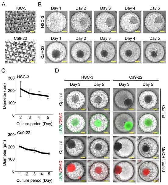 The formation of oral cancer cell spheroids in the microwell device. (A,B) Representative microscopic images with low ((A); scale bars: 500 μm) and high ((B); scale bars: 100 μm) magnifications. (C) The diameter of oral cancer cells spheroids (n = 3). (D) Representative microscopic images of live and dead cells of spheroid. Methanol-treated cells (MeOH treated) were used as a positive control for dead cells. Scale bars: 100 μm.