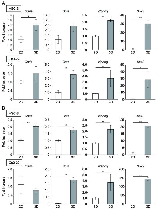 The expression of CSC marker genes in oral cancer cell spheroids. mRNA level of CSC markers in oral cancer cells cultured in the monolayer (2D) or microwell device (3D) for three (A) and five (B) days (n = 3). * p < 0.05, ** p < 0.01 (Student’s t-test).