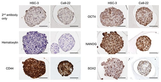 The expression and distribution of CSC marker proteins in the oral cancer cell spheroids. Representative immunohistochemical image for CSC markers in oral cancer cells cultured in the microwell device for three days. The cells were incubated without primary antibodies and used as negative controls (secondary antibody only). Counterstaining was performed using hematoxylin. Scale bars: 50 μm.