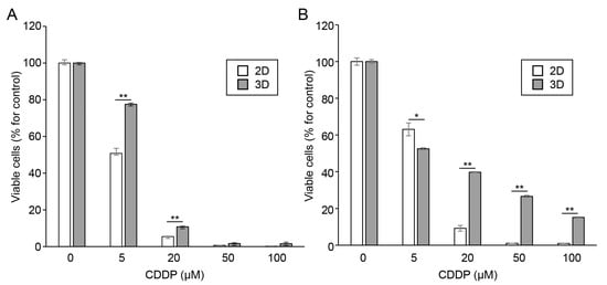 Sensitivity of oral cancer cell spheroids to anticancer drugs. The HSC-3 (A) and Ca9-22 (B) cells were cultured in monolayer (2D) or microwell chips (3D) were treated with cisplatin (CDDP; 0–100 μM) for 48 h. The proliferation of oral cancer cells was assessed using CCK-8 assay. Data are shown as the percentage of viable cells (n = 3). * p < 0.05, ** p < 0.01 (Student’s t-test).