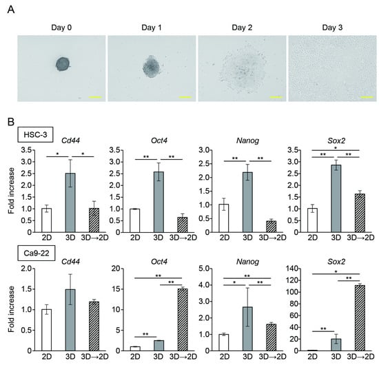 The expression of CSC marker genes in oral cancer cells outgrown from spheroids. (A) Representative microscopic image of outgrown cells from HSC-3 spheroids. Scale bars: 100 μm. (B) mRNA level of CSC marker genes in oral cancer cells cultured in monolayer (2D) or microwell device (3D) for three days or outgrown from spheroids (3D→2D) (n = 3). * p < 0.05, ** p < 0.01 (one-way ANOVA followed by Tukey’s test).