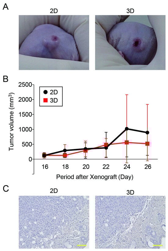 Finally, we compared the tumorigenicity of the HSC-3 cells between the 2D and 3D cultures using an in vivo xenograft model. Both the monolayer- and spheroid-cultured HSC-3 cells showed tumor-forming capabilities in the mice (Figure 6A). The tumor growth rate in the spheroid implantation group was comparable to that in the 2D culture group (Figure 6B). Furthermore, the results of our histological evaluation of tumor tissues showed no changes induced by the differences in culture methods (Figure 6C).