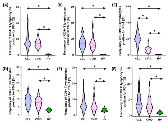 Schematic representation of the analysis of the percentage of selected subpopulations of T and B lymphocytes expressing positive PD-1 and PD-L1 among patients with CVID, CLL, and HV. (A) Percentage of CD4+ T cells positive for PD-1 expression; (B) percentage of CD8+ T cells positive for PD-1 expression; (C) percentage of CD19+ B cells positive for PD-1 expression; (D) percentage of CD4+ T cells positive for PD-L1 expression; (E) percentage of CD8+ T cells positive for PD-L1 expression; and (F) percentage of CD19+ B cells positive for PD-L1 expression. * statistically significant results. Abbreviations: CVID—common variable immunodeficiency; CLL—chronic lymphocytic leukemia; CD—cell differentiation antigen; PD-1—Programmed Cell Death Protein 1; PD-L1—Programmed Cell Death Ligand 1; and HV—healthy volunteers.
