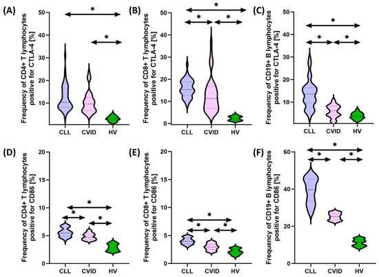 Schematic representation of the analysis of the percentage of selected subpopulations of T and B lymphocytes expressing positive CTLA-4 and CD86 among patients with CVID, CLL, and HV. (A) Percentage of CD4+ T cells positive for CTLA-4 expression; (B) percentage of CD8+ T cells positive for CTLA-4 expression; (C) percentage of CD19+ B cells positive for CTLA-4 expression; (D) percentage of CD4+ T cells positive for CD86expression; (E) percentage of CD8+ T cells positive for CD86 expression; and (F) percentage of CD19+ B cells positive for CD86 expression. * statistically significant results. Abbreviations: CVID—common variable immunodeficiency; CLL—chronic lymphocytic leukemia; CD—cell differentiation antigen; CTLA-4—cytotoxic T-lymphocyte-associated antigen 4; and HV—healthy volunteers.