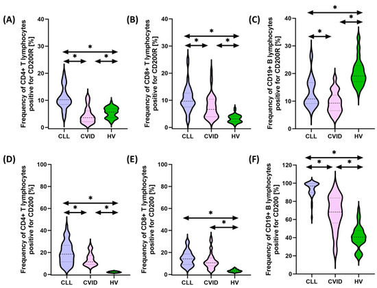 Schematic representation of the analysis of the percentage of selected subpopulations of T and B lymphocytes expressing positive CD200R and CD200 among patients with CVID, CLL, and HV. (A) Percentage of CD4+ T cells positive for CD200R expression; (B) percentage of CD8+ T cells positive for CD200R expression; (C) percentage of CD19+ B cells positive for CD200R expression; (D) percentage of CD4+ T cells positive for CD200 expression; (E) percentage of CD8+ T cells positive for CD200 expression; and (F) percentage of CD19+ B cells positive for CD200 expression. * statistically significant results. Abbreviations: CVID—common variable immunodeficiency; CLL—chronic lymphocytic leukemia; CD—cell differentiation antigen; and HV—healthy volunteers.