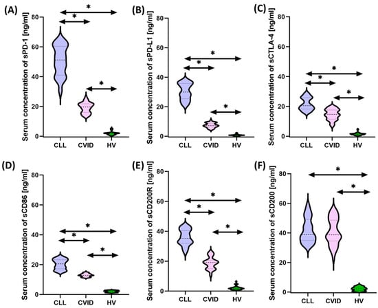 Schematic representation of the analysis of the serum concentration of soluble forms of the tested immune checkpoints and their ligands among patients with CVID, CLL, and HV. (A) Serum sPD-1 concentration; (B) serum PD-L1 concentrations; (C) serum sCTLA-4 concentration; (D) serum sCD86 concentration; (E) serum sCD200R concentration; and (F) serum sCD200 concentration; * statistically significant results. Abbreviations: CVID—common variable immunodeficiency; CLL—chronic lymphocytic leukemia; CD—cell differentiation antigen; PD-1—Programmed Cell Death Protein 1; PD-L1—Programmed Cell Death Ligand 1; CTLA-4—cytotoxic T-lymphocyte-associated antigen 4; and HV—healthy volunteers.