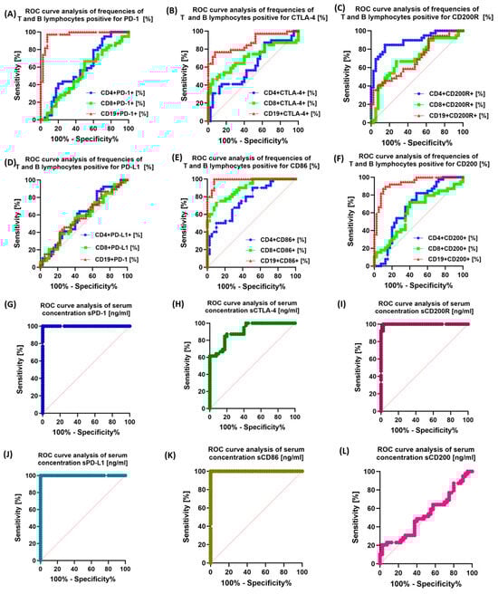 Analysis of ROC curves for the percentage of PD-1/PD-L1, CTLA-4/CD86, and CD200R/CD200 occurrence on selected T and B lymphocyte subpopulations and the raw concentration of tested molecules between the CLL and CVID patient groups. (A) ROC curve analysis of frequencies CD4+/CD8+ T lymphocytes and CD19+ B lymphocytes positive for PD-1 among CLL vs. CVID patients [%]; (B) ROC curve analysis of frequencies CD4+/CD8+ T lymphocytes and CD19+ B lymphocytes positive for CTLA-4 among CLL vs. CVID patients [%]; (C) ROC curve analysis of frequencies CD4+/CD8+ T lymphocytes and CD19+ B lymphocytes positive for CD200R among CLL vs. CVID patients [%]; (D) ROC curve analysis of frequencies CD4+/CD8+ T lymphocytes and CD19+ B lymphocytes positive for PD-L1 among CLL vs. CVID patients [%]; (E) ROC curve analysis of frequencies CD4+/CD8+ T lymphocytes and CD19+ B lymphocytes positive for CD86 among CLL vs. CVID patients [%]; (F) ROC curve analysis of frequencies CD4+/CD8+ T lymphocytes and CD19+ B lymphocytes positive for CD200 among CLL vs. CVID patients [%]; (G) ROC curve analysis of serum concentration of sPD-1 among CLL vs. CVID patients [ng/mL]; (H) ROC curve analysis of serum concentration of sCTLA-4 among CLL vs. CVID patients [ng/mL]; (I) ROC curve analysis of serum concentration of sCD200R among CLL vs. CVID patients [ng/mL]; (J) ROC curve analysis of serum concentration of sPD-L1 among CLL vs. CVID patients [ng/mL]; (K) ROC curve analysis of serum concentration of sCD86 among CLL vs. CVID patients [ng/mL]; and (L) ROC curve analysis of serum concentration of sCD200 among CLL vs. CVID patients [ng/mL].