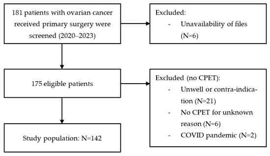 A total of 181 patients underwent primary surgery for ovarian cancer between January 2020 and January 2023 at the Northern Gynaecological Oncology Centre. Of these patients, 175 patients were eligible, excluding patients whose files were unavailable (N = 6). Thirty additional patients were excluded as no CPET was performed. Reasons for not performing CPET are detailed in Figure 1. The final study population included 142 patients.