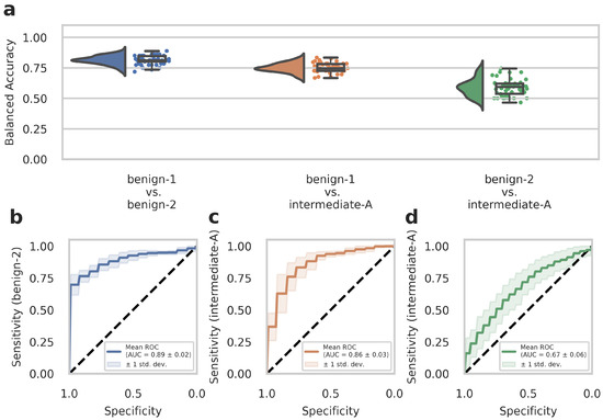 The deep neural network’s performance on the retrospective narrow validation Dataset B. (a) Raincloud plots (including probability distribution, box-whiskers plot, and data points from left to right) show balanced accuracy values representing discrimination power for each classification problem. Each data point represents one run of the cross-validation. (b–d) ROC curves illustrate the diagnostic performance of each pairwise classification. Visualized is the mean ROC curve over the runs. They correspond to the same pairwise combinations as the raincloud plots above. The plots show the sensitivity of one class per two-class classification problem, as labeled on the y-axis, against specificity on the x-axis. Transparent areas indicate one standard deviation of the mean curve. ROC curves represent the model’s prediction at different prediction score thresholds. A larger area under the curve represents a more confident model. Methylation classes are benign-1 (n = 13), benign-2 (n = 19), and intermediate-A (n = 19).