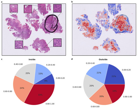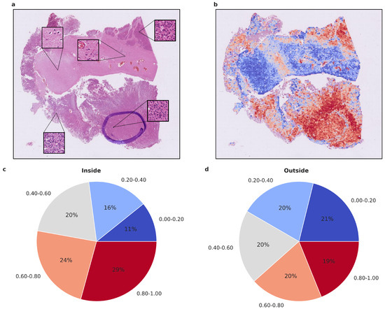 Visualized attention map and attention map statistics of benign-1 vs. intermediate-A classification. (a,b) For qualitative evaluation, the location and attention value as a red-blue color grade of 20× magnification tiles of WSIs is visualized (b), Colors can be interpreted as representing a certain range in percentage of attention. Blue 0–20% (least important), Light blue 20–40%, Gray 40–60%, Orange 60–80%, Red 80–100% (most important), and the corresponding HE-image is shown (a). The attention map of a representative tumor section visualizes the relative importance of each tile for the overall prediction. A low importance is illustrated by dark blue, and a high importance in dark red on the color map. High-attention tiles are enriched in tumor areas, which becomes especially visible when compared to the section area preselected for DNA extraction by the neuropathologist. (c,d) Attention map statistics to evaluate the relative proportion of high and low attention values inside (c) and outside (d) the tumor areas, highlighted by a neuropathologist. The color grades were grouped into 5 discrete classes. Only attention maps at 20× were considered for this evaluation, and proportion was computed per attention map and averaged overall. A higher proportion of high-attention tiles inside the marked area is in line with a high tumor area percentage inside this area. Methylation classes benign-1 (n = 13) and intermediate-A (n = 17).