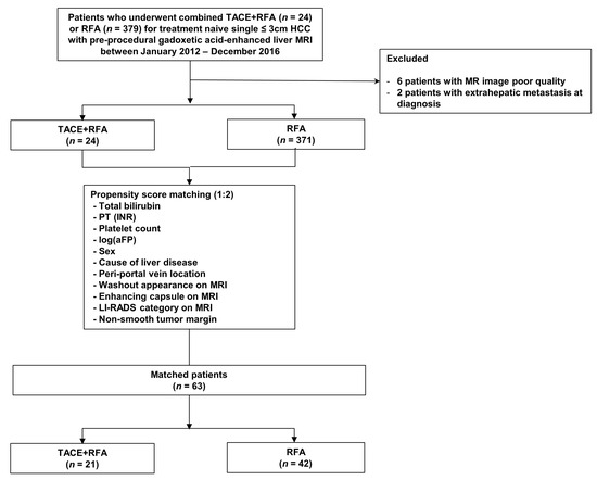 - Chu, H.H.; Kim, J.H.; Yoon, H.K.; Ko, H.K.; Gwon, D.I.; Kim, P.N.; Sung, K.B.; Ko, G.Y.; Kim, S.Y.; Park, S.H. Chemoembolization Combined with Radiofrequency Ablation for Medium-Sized Hepatocellular Carcinoma: A Propensity-Score Analysis. J. Vasc. Interv. Radiol. 2019, 30, 1533–1543. [Google Scholar]