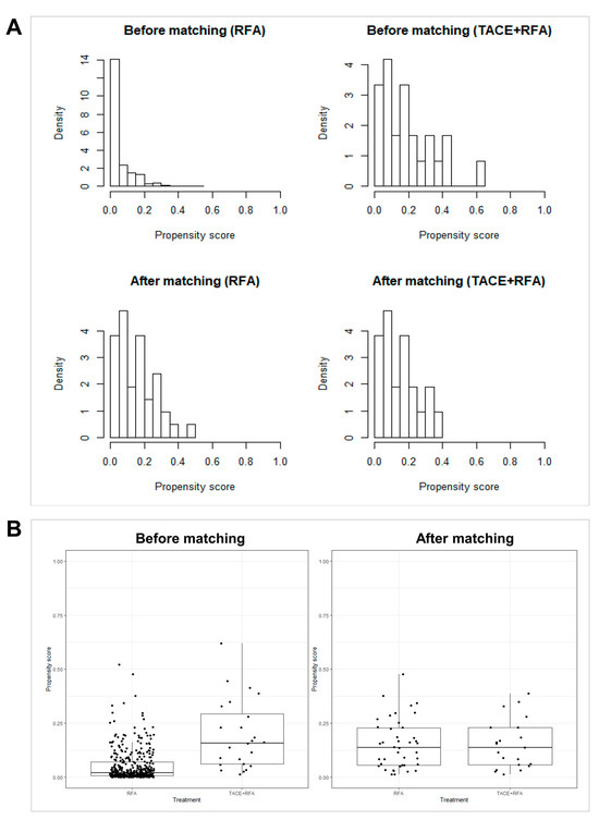 Histogram (A) and jitter plot (B) illustrating the distribution of propensity scores before and after propensity score matching between the TACE + RFA group and the RFA group.