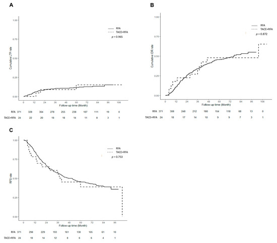 LTP. LTP occurred in 3 (3/24, 12.5%) patients in the TACE + RFA group and 44 (44/371, 11.9%) patients in the RFA group during follow-up (p = 0.965, Figure 3A). Cumulative incidence rates were lower in the TACE + RFA group than in the RFA group at 1 year (0.0% vs. 5.4%, p < 0.001) and did not significantly differ at 2 (9.1% vs. 8.6%, p = 0.939) or 5 years (15.2% vs. 11.5%, p = 0.667).