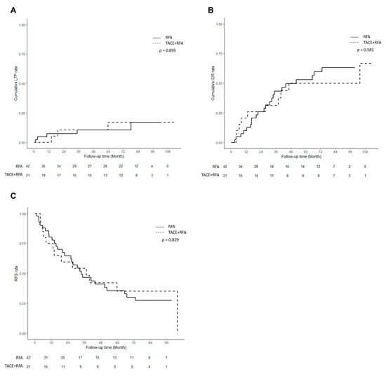 LTP. When using matched data, LTP occurred in three (3/21, 14.3%) patients in the TACE + RFA group and five (5/42, 11.9%) patients in the RFA group during follow-up (p = 0.895, Figure 4A). Cumulative LTP rates did not significantly differ between the two groups at 1 (0.0% vs. 7.4%, p = 0.072), 2 (10.5% vs. 7.4%, p = 0.701), or 5 years (16.9% vs. 10.5%, p = 0.531).