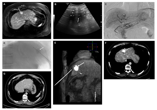 A 40-year-old male with chronic hepatitis B virus-associated chronic liver disease. (A) A 2 cm sized hepatocellular carcinoma (arrow) is seen in liver segment 4. Notice the location of the tumor, which is located posteriorly to the right costochondral junction (arrowhead). (B) Observation of a subtle hypoechoic lesion which had a very poor sonic window due to posterior acoustic shadowing (arrowheads) from the overlying costochondral junction upon planning ultrasound to evaluate the feasibility of ultrasound (US)-guided radiofrequency ablation (RFA. The lesion was regarded as infeasible for conventional US-guided RFA. (C) Patient underwent fluoroscopy guided-transarterial chemoembolization (TACE) combined with RFA (TACE + RFA). On the hepatic angiogram, nodular tumor staining is noted in liver segment 4 (arrow). Embolization using a mixture of 10 mg of adriamycin and 2 mL of iodized oil was performed after superselecting the feeding vessel. (D,E) Insertion of a 17-G RFA needle (2 cm active tip) into the tumor (arrow) immediately afterward under conventional fluoroscopic and cone-beam computed tomography (CT) guidance. (F) Liver CT obtained one day after TACE + RFA showing compact lipiodol uptake within the target lesion (arrow) and peritumoral ablation zone (arrowhead). It was regarded as a technical success. (G) Liver CT obtained 85 months after TACE + RFA showing that a small amount of iodized oil remained within the shrunken treated tumor (arrow). There was no evidence of local tumor progression or other kinds of recurrence.