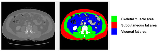 We utilized a semi-automated open-source software (BMI measurement tools, version 1.0; https://sourceforge.net/projects/muscle-fat-area-measurement (accessed on 30 June 2020)) to measure the cross-sectional area (cm2) of the skeletal muscles based on attenuation segmentation. The Hounsfield unit (HU) thresholds ranged from −29 to 150 HU for skeletal muscle mass, −190 to −30 HU for subcutaneous fat, and −150 to −50 HU for visceral fat, as shown in Figure 1. Measurements were obtained from CT scans performed within 1 month prior to TARE at the level of the transverse processes of the third lumbar (L3) vertebra. The cross-sectional area of the muscle was segmented by a single trained researcher (HY), who was blinded to subject identification and outcomes. Through drawing a single peritoneal line on the CT image, researchers could easily and swiftly obtain measurements, including abdominal circumference, abdominal muscle area, subcutaneous fat area, and visceral fat area.