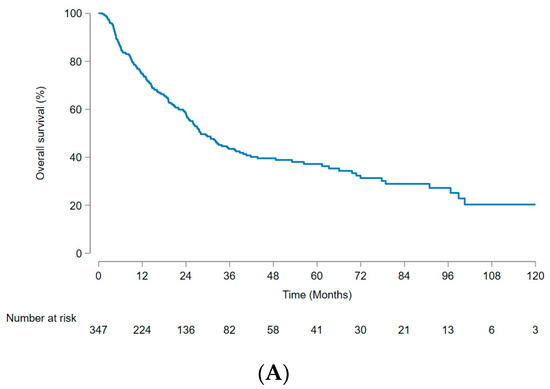 Categorical variables are presented as counts and percentages [n (%)]. Continuous variables are expressed as either the mean ± standard deviation or median with interquartile range and were transformed into two-level categorical data based on their median values. Appropriate statistical tests, including the Chi-square test, Fisher’s exact test, Student’s t-test, and Mann–Whitney U-test, were used for the analysis. The Kaplan–Meier method was used to estimate the cumulative incidence of events over time. Differences between groups were analyzed using the log-rank test, and the Bonferroni correction was applied to account for multiple comparisons. Univariate and multivariate Cox proportional hazards regression models were used to assess the risk factors for OS and PFS. Statistical significance was set at p < 0.05. All statistical analyses were performed using STATA software 17 (StataCorp LLC, College Station, TX, USA).