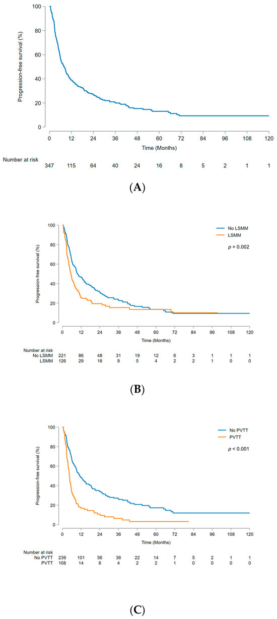 The median PFS was 8.0 (95% CI, 6.4–9.4) months, and the 1-, 3-, and 5-year PFS rates were 38.9% (95% CI, 33.7–44.2%), 20.4% (95% CI, 15.8–25.4%), and 13.1% (95% CI, 8.9–18.1%), respectively (Figure 3A). Analysis of factors affecting PFS yielded findings consistent with the aforementioned OS analysis results. The no-LSMM group demonstrated significantly better outcomes than the LSMM group (p = 0.002) (Figure 3B), and the patients without PVTT had significantly better outcomes than those with PVTT (p < 0.001) (Figure 3C). LSMM (HR 1.54; 95% CI, 1.19–1.98; p = 0.001), PVTT (HR 2.08; 95% CI, 1.59–2.72; p < 0.001), AFP (≥200 ng/mL) (HR 1.38; 95% CI, 1.07–1.77; p = 0.013), ALBI grade (2–3) (HR 1.49; 95% CI, 1.15–1.93; p = 0.002), and tumor number (≥2) (HR 1.55; 95% CI, 1.20–2.01; p = 0.001) were independently correlated with PFS (Table 3).