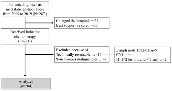 Consecutive patients diagnosed with metastatic gastric adenocarcinoma who received systemic chemotherapy at Nagoya University Hospital between January 2009 and December 2019 were included in this study. We classified them into two groups based on whether they underwent CS (CS and non-CS groups). In this study, patients with technically resectable metastases at the initial diagnosis, or synchronous malignancies, were excluded. Additionally, patients with esophagogastric junction cancer were also excluded. Using previous biological categories (Yoshida classification) [18], technically resectable metastasis was defined and classified as one of the following: (1) ≤2 metastatic nodules in the liver with ≤5 cm diameter (maximum), (2) positive cytology status (CY1), or (3) suspected para-aortic lymph node metastases in the region between the celiac axis and inferior mesenteric artery (no. 16a2 and/or 16b1). Tumor staging and histopathological grading were performed according to the 15th edition of the Japanese Classification of Gastric Carcinoma [19]. Distant metastases, other than technically resectable metastases as defined by the Yoshida classification, were defined as non-curable factors. Hematologic metastasis was defined as metastasis to the bone, liver, lung, and other organs, and lymphogenous metastasis was defined as distant lymph node metastasis. The flow diagram of the patients enrolled in this study is shown in Figure 1.