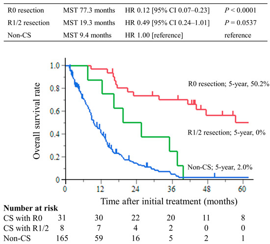 The median follow-up period was 8.7 months (interquartile range (IQR), 4.3–14.4 months) in the non-CS group and 39.8 months (IQR, 17.3–56.6 months) in the CS group. The median survival times (MST) were 77.3 months in the CS with R0 resection group, 19.3 months in the R1/2 resection group, and 9.4 months in the non-CS group. The hazard ratios for OS in the R0 resection group were 0.12 (95% CI, 0.07–0.23; p < 0.0001) compared with the non-CS group, while in the R1/2 resection group, it was 0.49 (95% CI, 0.24–1.01; p = 0.0537). The hazard ratios for OS compared with the R1/2 group were 0.25 (95% CI, 0.11–0.63; p = 0.0029) in the R0 resection group (Figure 2). This trend was the same for all of the Yoshida classification categories (Figure 3).