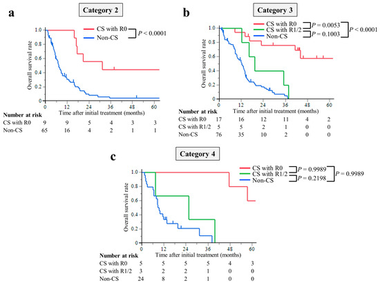 Kaplan–Meier curves for overall survival of patients stratified using the Yoshida classification: (a) Category 2, (b) Category 3, and (c) Category 4. The overall survival time of the CS with R0 resection group was significantly longer than that of the non-CS group in any Yoshida classification category.