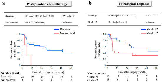 The RFS was analyzed in 31 patients who underwent CS with R0 resection. The median RFS was 29.4 months (IQR, 5.7–49.9 months), and the 3-year RFS rate was 43.8%. Among these, patients who received postoperative chemotherapy had significantly longer RFS times than those who did not (HR, 0.22; 95% CI, 0.06–0.83; p = 0.0250, Figure 4a). Patients with pathological response grade ≥ 2 had a longer RFS times, but the difference was not significant (HR, 0.49; 95% CI, 0.19–1.23; p = 0.1301, Figure 4b).