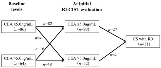 Figure 5 shows the association between changes in CEA levels from baseline to the initial RECIST evaluation and CS with R0 resection. Among the 64 patients with CEA levels > 5.0 ng/mL at baseline, 16 (25.0%) exhibited a decrease in CEA levels to ≤5.0 ng/mL at the initial RECIST evaluation. In contrast, among the 86 patients with CEA levels ≤ 5.0 ng/mL at baseline, 4 (4.7%) had an increase in CEA levels to >5.0 ng/mL at the initial RECIST evaluation, and none of these patients achieved CS with R0 resection. Of the patients with CEA levels ≤ 5.0 ng/mL at the initial RECIST evaluation (n = 98), 27 (28%) achieved CS with R0 resection. In contrast, only 4 (7.7%) patients with CEA levels > 5.0 ng/mL at the initial RECIST evaluation (n = 52) achieved CS with R0 resection, which was significantly less frequent (p = 0.0043).