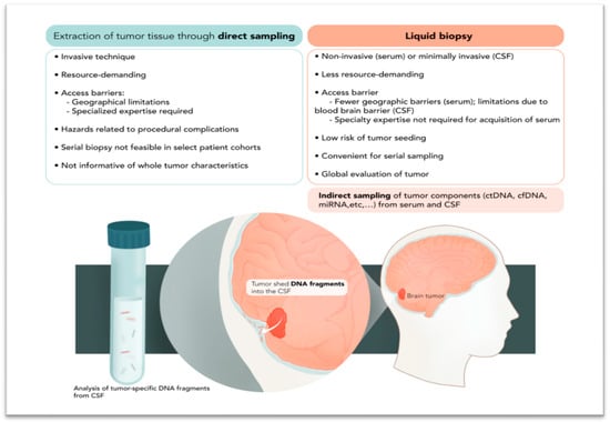 Since the discovery of the significant prognostic impact of certain molecular alterations and the emerging role of therapeutically targeting these alterations in central nervous system (CNS) tumors, the molecular profiling of CNS tumors has become an integral component of routine neuro-oncologic care. Currently, the molecular profiling of CNS tumors is mainly achieved through invasive procedures such as tissue biopsy and surgical resection. In addition to being costly, these procedures can be associated with complications and are especially challenging for disseminated disease and tumors located in eloquent regions of the brain. Due to these reasons, liquid biopsy is an attractive option for the genetic profiling of CNS tumors []. Moreover, in comparison to conventional tissue sampling, liquid biopsy provides the opportunity to capture the complex heterogeneity of the whole tumor and provides information about global tumor characteristics, which is important given the prominent intra-tumoral heterogeneity of CNS tumors []. Not only has the genomic information obtained through liquid biopsy been found to closely match and correlate with respective glioma tumor tissue, in some instances, liquid biopsy has provided further information that was unidentifiable through tissue sampling []. Figure 1 summarizes the advantages of liquid biopsy compared with direct tumor sampling through tissue biopsy.