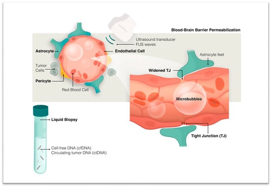 As discussed in the previous section, the BBB seems to act as a functional and structural barrier in the release of brain tumor biomarkers into the circulation. Due to the numerous benefits of liquid biopsy, exploring non-invasive approaches that can induce transient BBB opening and enhance the release of brain-tumor-derived biomarkers into the circulation is of utmost importance. Since the initial discovery of its biological effect, focused ultrasound (FUS) has been used as a tool for ablating tumor tissue and enhancing drug delivery through the targeted disruption of the BBB (Figure 2). The many advantages of FUS, such as non-invasiveness, high temporal resolution, and reversibility, make it a promising tool for increased access to the brain, both for the delivery of therapeutics and tumor-derived biomarker detection. High-intensity focused ultrasound (HIFU) can significantly increase tissue temperature, thus providing the therapeutic opportunity for the selective thermocoagulation of brain tumors [,].