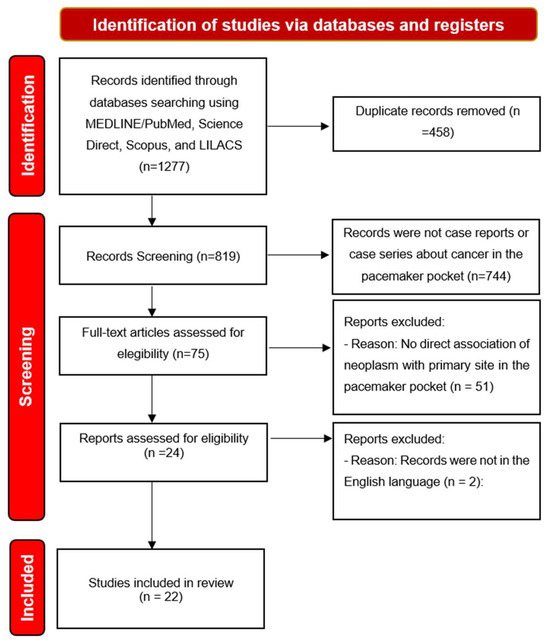 This study used references describing cancer at the primary site in the pacemaker pocket indexed in the PubMed/Medline, SCOPUS, Web of Science, and LILACS databases. The following descriptors were used: “Cancer”, “malignancy”, “tumor”, “malignancies”, “carcinoma”, “Plasmacytoma”, “neoplasms”, “neoplasia”, “lymphoma”, “adenocarcinoma”, “leiomyosarcoma”, “histiocytoma”, “artificial pacemaker”, “Resynchronization therapy”, “CIED”, “cardiac implantable electronic devices”, “cardiac pacemaker”, “cardiac pacing artificial”, “implantable pacemaker”, “pacemaker pocket”, “pacemaker cavity”, “pacemaker implantation site”, “pacemaker sac”. For the combination of terms in the databases, we used Boolean connectors (OR, AND). For the inclusion of additional articles, a manual search was performed in the references of the selected studies and notification alerts in the databases were activated if new titles that suited the query were published. In addition, research was also carried out using abstracts, articles, and scientific presentations from virtual meetings of the American Society of Clinical Oncology [21] and the American College of Cardiology [22].