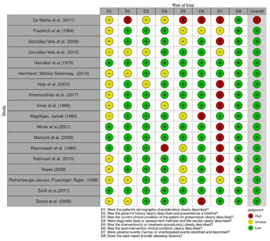 Risk of bias among case reports [24,25,26,27,28,29,30,31,32,34,35,36,37,39,40,41,42,43].