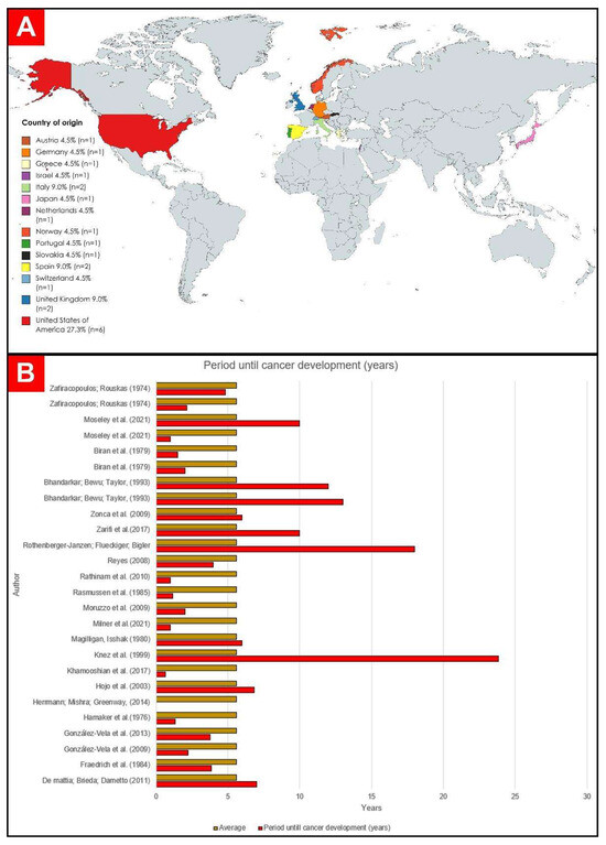 (A) Countries of origin of the selected publications. (B) Graphic representation of time to development of cancer in years [19,24,25,26,27,28,29,30,31,32,33,34,35,36,37,38,39,40,41,42,43,44].