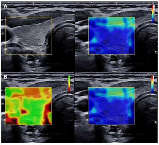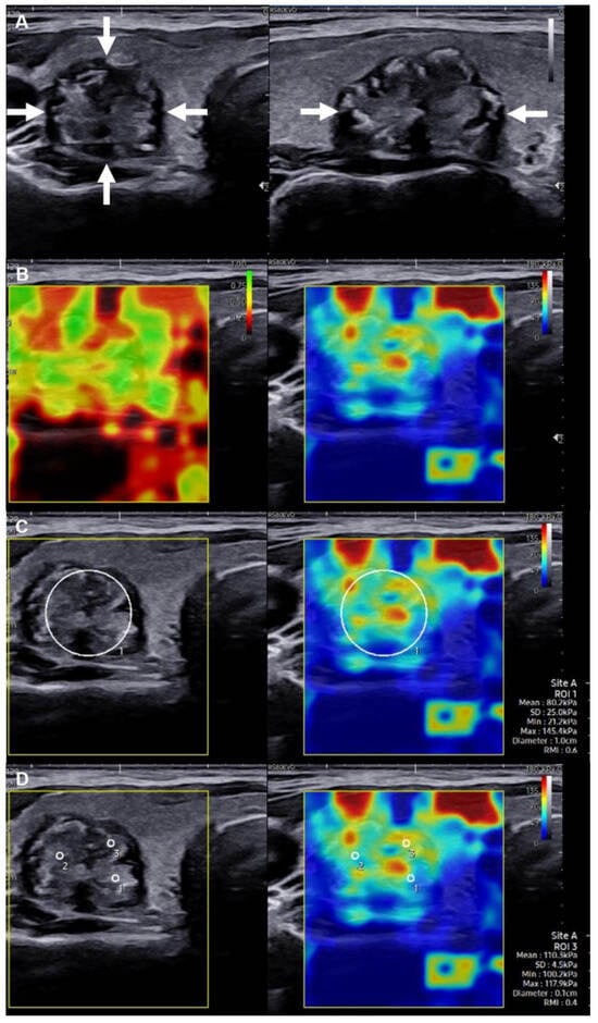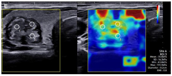 Shear wave elastography (SWE) is an advanced elastography technique that is used to quantitatively evaluate tissue stiffness, a factor that is crucial for distinguishing between benign and malignant lesions. In this method, shear waves are generated through the effective vibration of tissue particles, which is initiated by an acoustic radiation pulse emitted by a transducer [1]. These shear waves are subsequently employed to calculate the Young’s modulus, measured in kilopascals (kPa). SWE minimizes dependence on the skills of the individual operator, leading to high reproducibility and standardized quantitative assessment [2]. Consequently, SWE has emerged as a preferred approach, particularly valued for its quantitative capability in differentiating between various types of lesions, including those occurring in the thyroid [3,4,5,6,7,8,9], breast [10,11,12], and lymph nodes [13,14]. A meta-analysis conducted by Filho et al. [15] examined the use of SWE devices from various manufacturers to distinguish between benign and malignant thyroid nodules. Their findings revealed sensitivities ranging from 63% to 77%, specificities between 76% and 81%, and area under the receiver operating characteristic (ROC) curve (AUC) values ranging from 0.84 to 0.88. They concluded that SWE is an essential tool that can complement ultrasound (US) in clinical practice for the diagnostic differentiation between benign and malignant thyroid nodules.