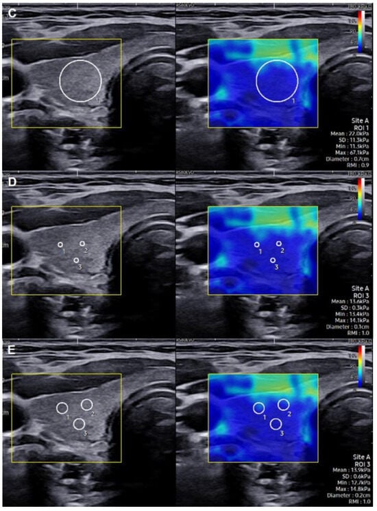 This study recorded SWE elasticity metrics, which included the maximum (Emax), mean (Emean), minimum (Emin), and standard deviation (ESD) elasticity values for all ROIs, in kilopascals (kPa). The same methodology was applied to normal subjects to determine the SWE elasticity metrics for the normal thyroid parenchyma (Figure 2). To evaluate intraobserver agreement, the same investigator repeated measurements on a randomly selected subset of 20 cases. This subset included both malignant (Bethesda category V or VI) and benign (Bethesda category II) nodules. The repeated measurements were conducted with a 1-month interval between measurements [28].