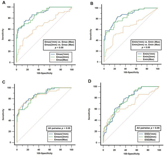 Comparison of diagnostic performance in predicting malignant nodules among (A) Emax, (B) Emin, (C) Emean and (D) ESD derived from the three ROIs.