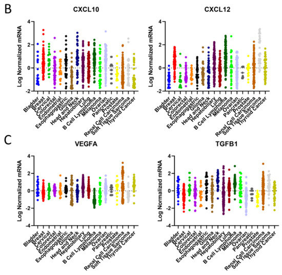 Pan-cancer profiling based on the Cancer Genome Atlas Databases of (A) immune cytokines; (B) chemokines; (C) immunosuppressive mediators. While most cytokines exert pro-inflammatory anti-tumor immune responses, some such as IL-6, TNF-α, and IL-10 have immunosuppressive roles.