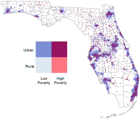 Map of centroid of census tracts to show general distribution or communities in Florida. Rurality and poverty combined into four categories. Urban poverty is shown in maroon.