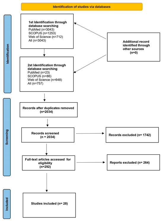 A total of 3800 articles were established based on the search terms given above, among which 1766 duplicated records were removed. After the initial screening, 1742 articles not relevant to our study were removed. In total, 292 studies were eligible for a full-text assessment, of which 264 were removed because they did not meet the criteria of inclusion. In the end, 28 studies were included in this review. The time range of the published articles was 2014–2022, and the studies were both prospective and retrospective. Table 1 summarizes the main features of the selected studies, and Table 2 summarizes the key findings of the selected studies.