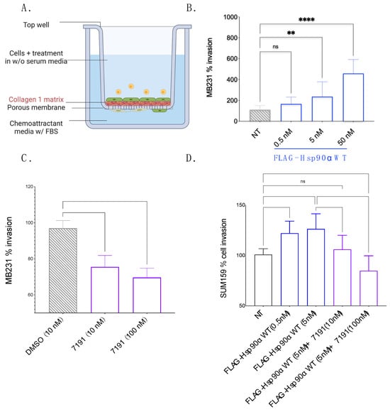 eHsp90 increases invasion of breast cancer cells through Collagen-1. (A). Schematic representation of Collagen-1-coated Transwell setup. The cells and treatment conditions mixed in the SS media were added to the top well. The cells invaded through the Collagen-1 matrix and the porous membrane toward the serum containing chemoattractant media. The cells that successfully invaded the other side of the membrane were counted. (B). MB231 invasion through Collagen-1 in a Transwell setup after cells in the top well were treated with exogenous FLAG-Hsp90α WT (one-way ANOVA p < 0.0001). (C). MB231 invasion through Collagen-1 in a Transwell setup after cells in the top well were treated with 7191 (one-way ANOVA p—0.0019) toward 2% FBS media for 8 h. (D). SUM159 invasion through Collagen-1 in a Transwell setup toward 1% FBS media for 4 h after treatment with FLAG-Hsp90α WT and 7191 (one-way ANOVA p < 0.0001). (B,D). p-value for pairwise comparison is depicted as—<0.1234 as “NS”, <0.0021 as “**”, and <0.0001 as “****”.